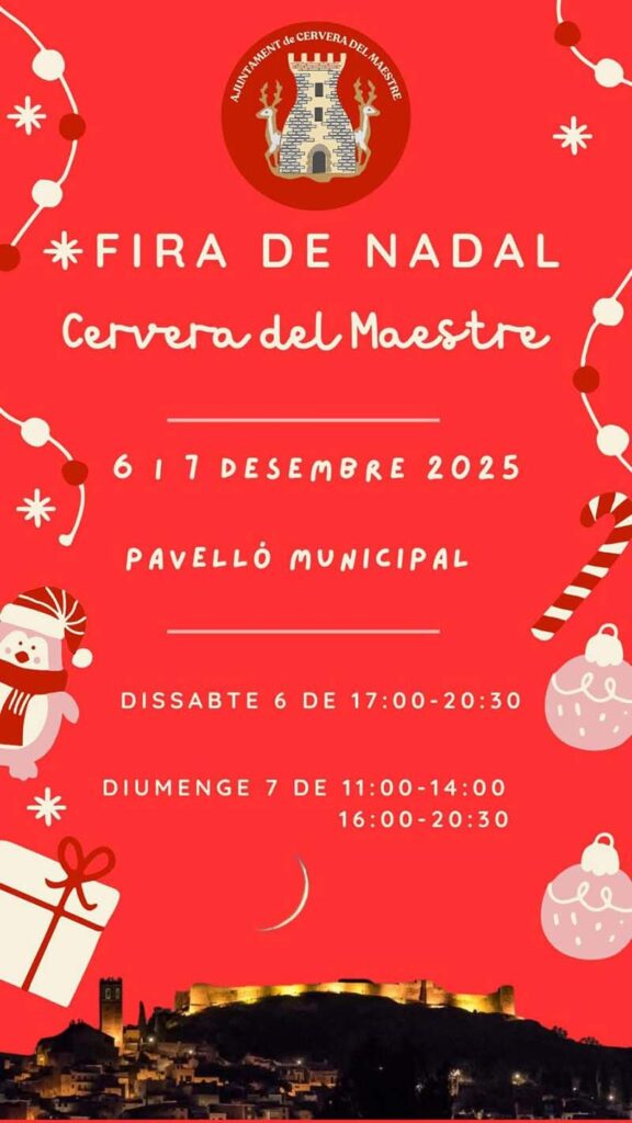 El municipi de Cervera del Maestre celebrarà la seva tradicional Fira de Nadal els propers 6 i 7 de desembre de 2025, al Pavelló Municipal.
