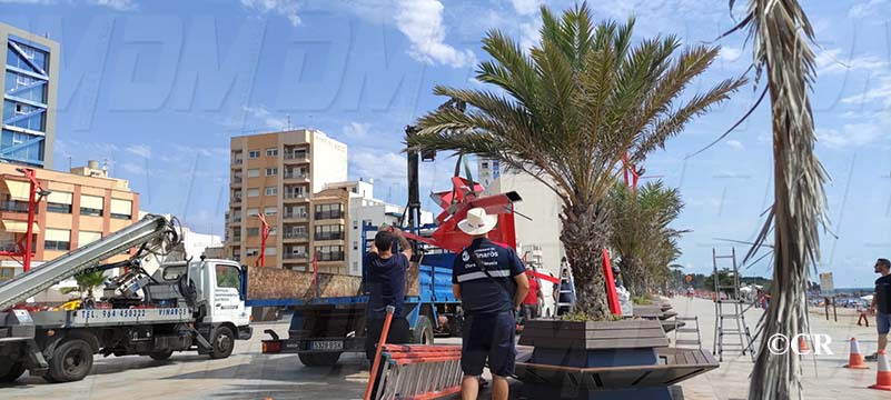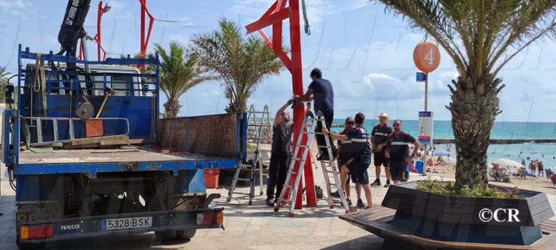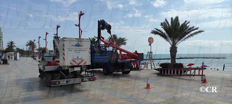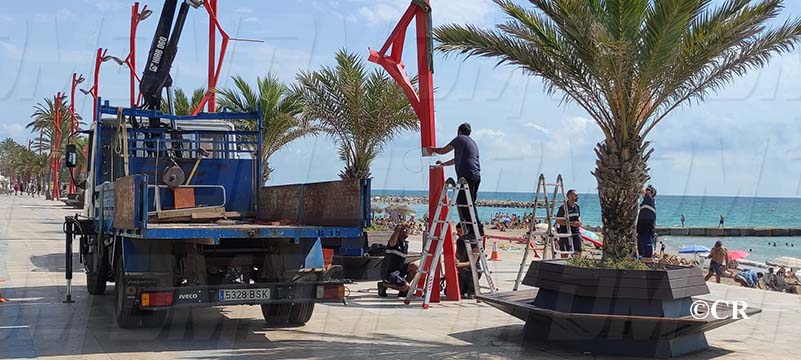 La farola sostenia una de les parts del tendall situat entre l’Oficina de Turisme i la Pèrgola del propi Passeig Marítim.