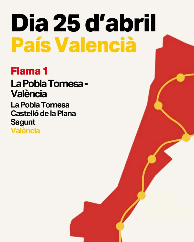 L’endemà, 25 d’abril, una data clau per a la memòria col·lectiva del poble valencià, la flama eixirà de La Pobla Tornesa i farà parada a Castelló de la Plana abans d’arribar a València, on tindran lloc els actes centrals del Dia del País Valencià.