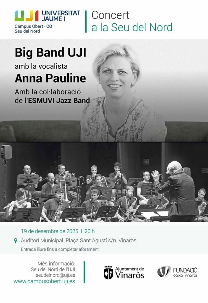 L’Auditori Municipal Wenceslao Ayguals d’Izco acollirà, demà per la vesprada, el concert de la Big Band de la Universitat Jaume I, amb la vocalista Anna Pauline i amb la col·laboració de l’ESMUVI Jazz Band.