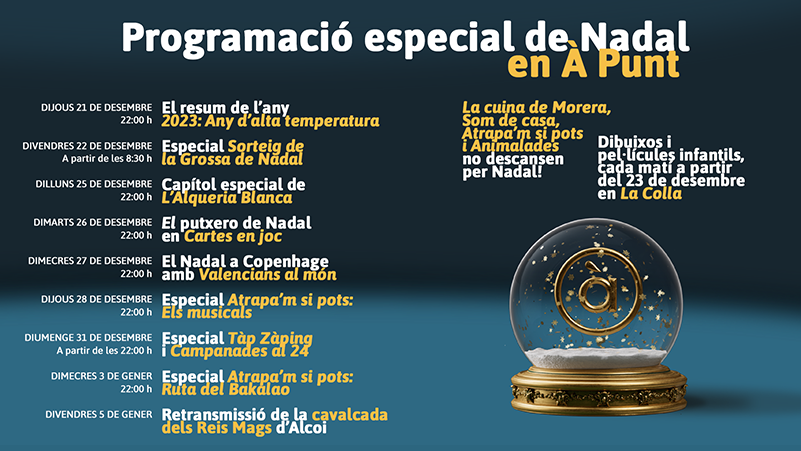 À Punt ha preparat per als valencians una programació especial per a disfrutar des de casa de les festes de Nadal. Del sorteig de la Grossa a la tradicional cavalcada de Reis, passant per les campanades i altres continguts que no poden faltar les dues setmanes de Nadal.