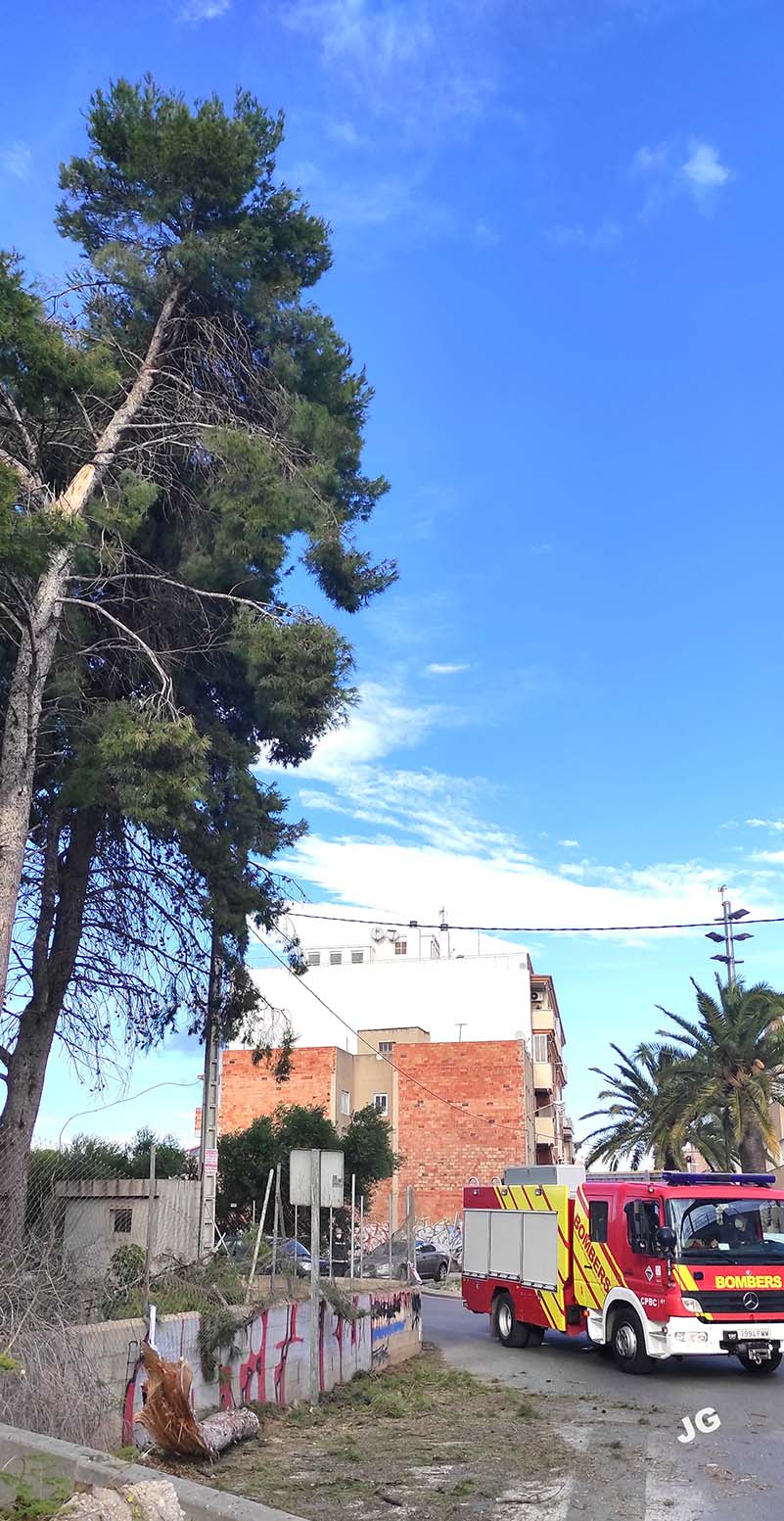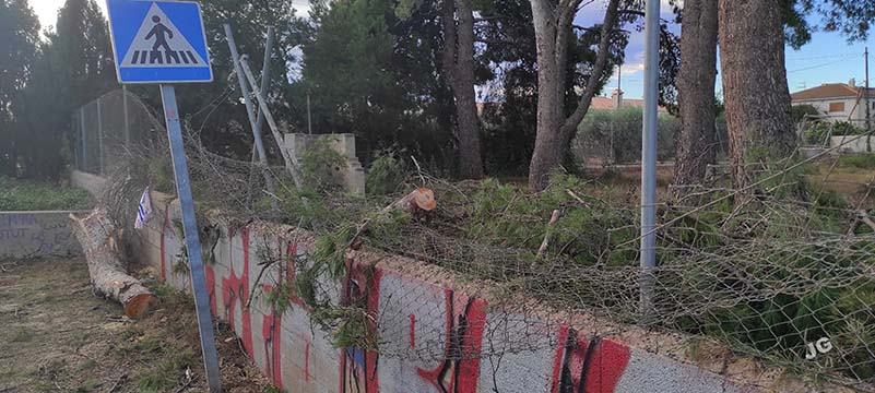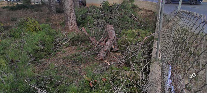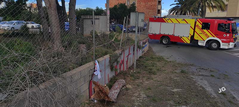 Alrededor de las 15 horas, en la intersección de la calle Peñiscola con Avda. Corts Valencians, debido al fuerte viento, una rama de pino ha sufrido un desgarro, causando datos materiales a la valla metalica de cerramiento de la parcela donde se encuentran estos pinos.