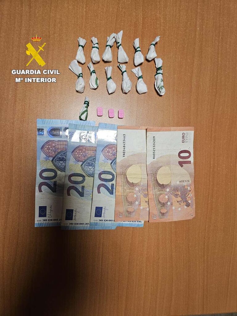 Ante la sospecha de que pudiera tratarse de droga, se acercaron e identificaron al varón quien mostró en esos momentos una actitud muy nerviosa por lo que realizaron un registro a sus pertenencias y el vehículo encontrando una riñonera en cuyo interior portaba 12 dosis de cocaína y 3 pastillas de posiblemente MDMA, además se le intervinieron 80 euros posiblemente procedentes de la venta de este tipo de sustancias. Por estos hechos el hombre fue detenido.