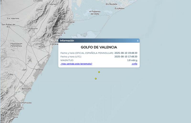 Durant la vesprada del diumenge 10 d’agost, es van produïr dos moviments sísmics en la zona del golf de València, a 18 km i a 23 km a l’est de la costa de Vinaròs.
