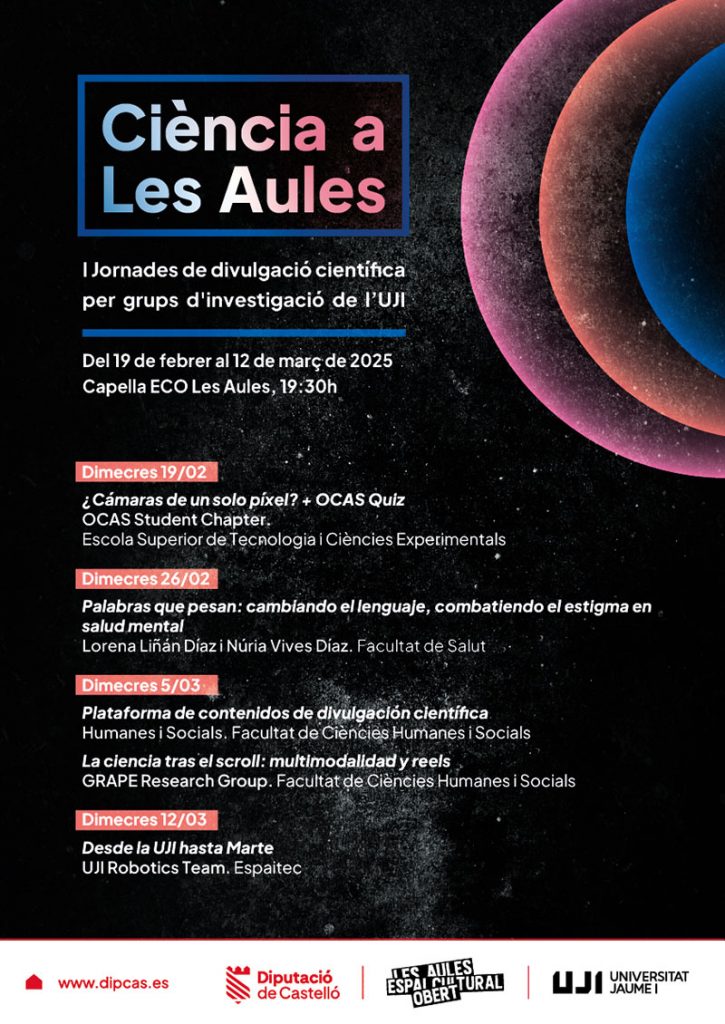 Ciència a Les Aules reparte el protagonismo entre grupos de investigación de varias facultades de la Universitat Jaume I (UJI) de Castelló. El objetivo es exponer en público sus últimos avances científicos con un formato divulgativo de tono ameno y cercano. Cada una de las cuatro sesiones contará con una exposición inicial sobre el tema programado. A continuación, el público tomará parte activa dentro de un vínculo de intercambio de ideas para explorar cómo la investigación científica puede impactar en la vida cotidiana de las personas.