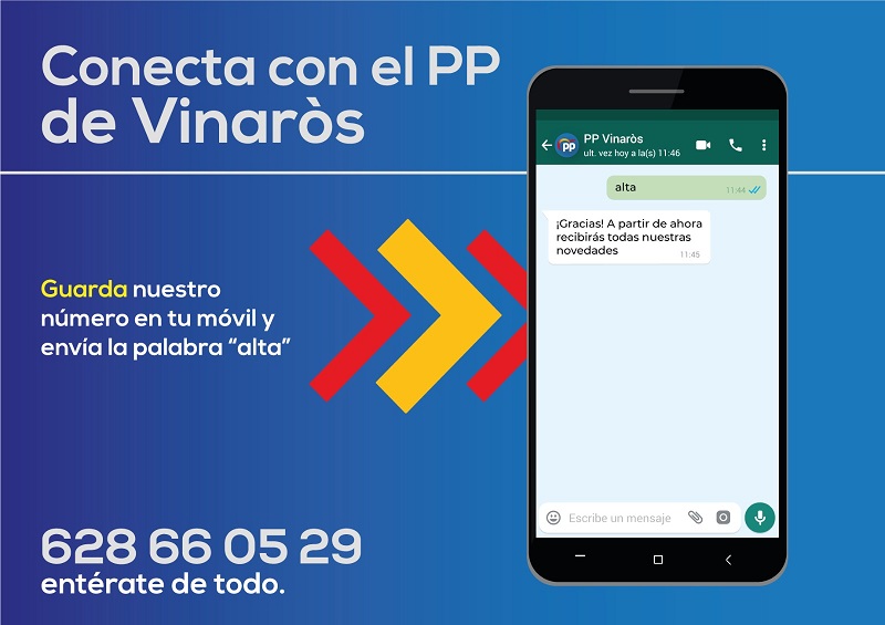 Gandía ha señalado también que “unirse a este canal de información es muy sencillo y totalmente confidencial. Únicamente debe guardarse en la memoria del teléfono móvil el número del PP que es el 628 66 05 29 y enviar por WhatsApp la palabra “alta” para empezar a recibir las informaciones del Partido Popular de Vinaròs”.