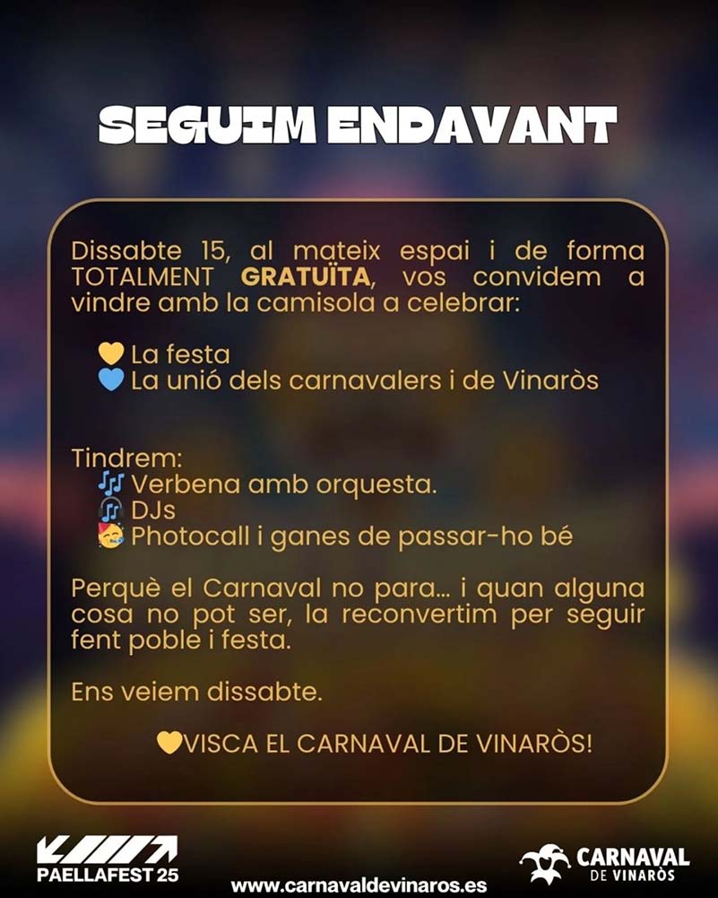 El Carnaval de Vinaròs ha anunciat, a través de les seves xarxes socials, la suspensió de la celebració de la festa d’El Verbenazo del Paellafest, prevista per al dissabte 15 de novembre, per “motius d’organització i seguretat”.