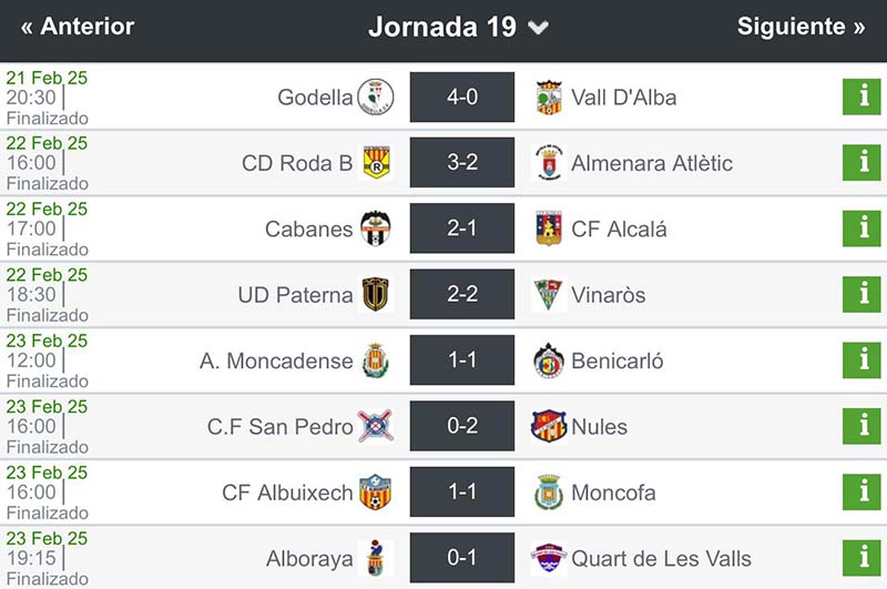 Aquest resultat fa que el club Benicarlando continuï liderant la classificació amb 39 punts, amb 5 punts per davant del Quart de les Valls que està en segona posició amb 34 punts.