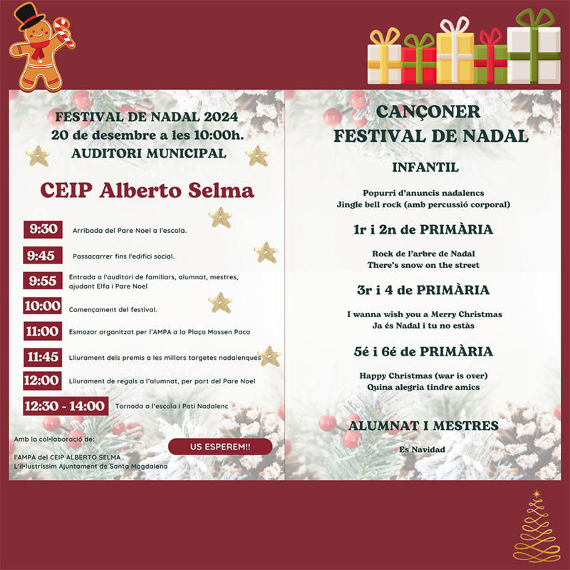 El col·legi públic, en col·laboració amb l’AMPA i l’Ajuntament han preparat una intensa jornada festiva per a celebrar l’arribada de Nadal, que arrancarà amb la visita del Pare Noel a les instal·lacions del col·legi. Posteriorment, alumnat i professorat es desplaçaran al costat del Pare Noel fins a l’Auditori, lloc en el qual a partir de les 10h se celebrarà el tradicional Festival de Nadal, obert a tota la població.