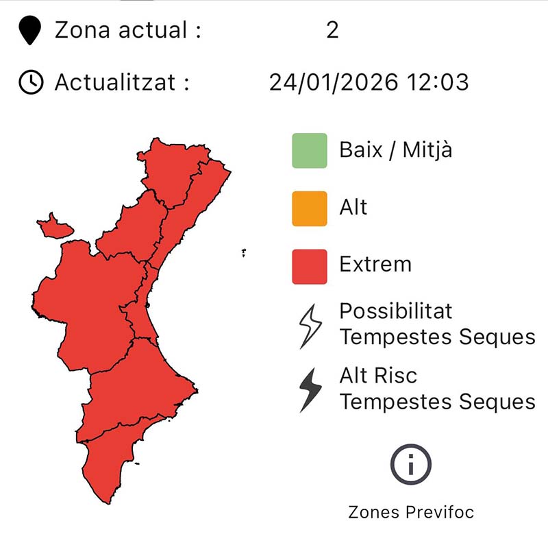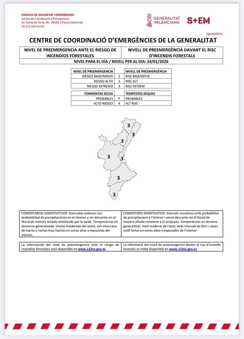 El Centre de Coordinació d’Emergències de la Generalitat ha establit el nivell de preemergència davant el risc d’incendis forestals per al dia 24 de gener de 2026.