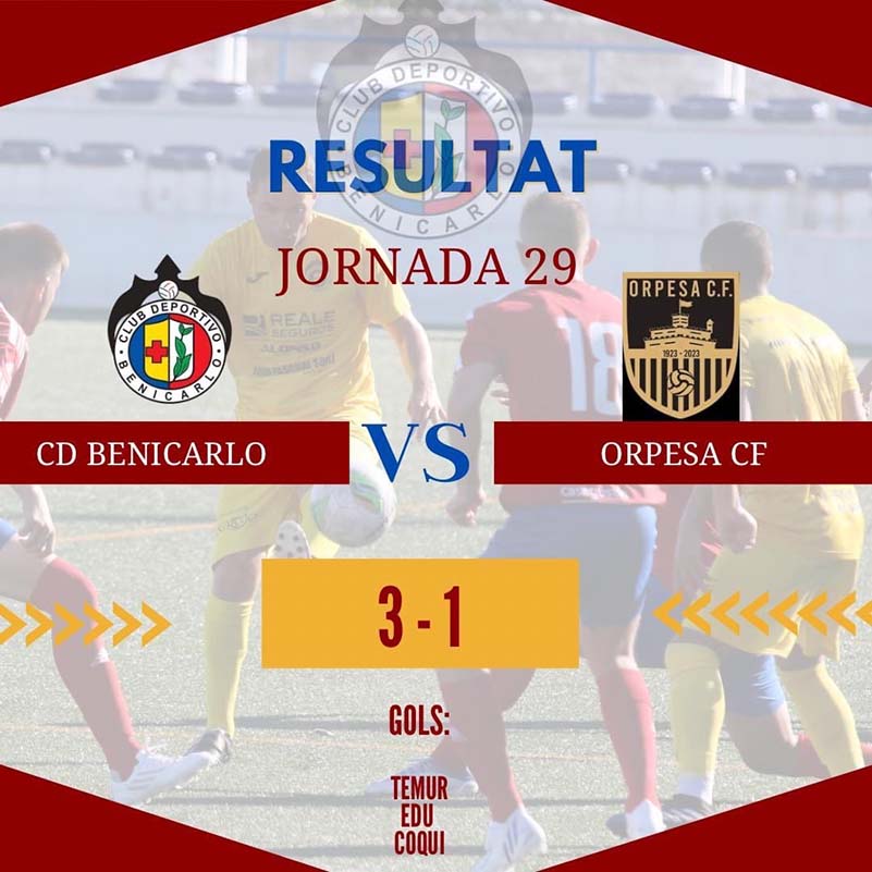 - El pasado sábado 13 de mayo de 2023, en el campo de fútbol de Benicarló, Pichi Alonso, se llevó a cabo el penúltimo partido de la temporada 2022-2023. Los goles de Abel, Edu y Coqui, llevaron la victoria al club benicarlando que jugaba contra el Oropesa CF.