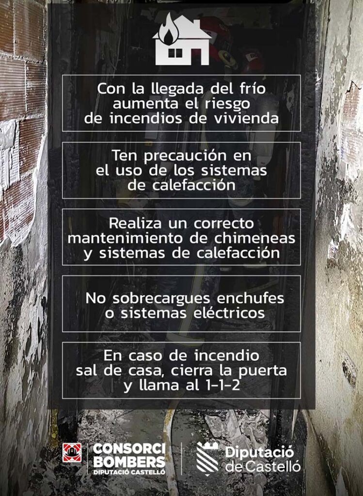 Amb la baixada de les temperatures i l’increment de l’ús dels sistemes de calefacció, el Consorci Provincial de Bombers de la Diputació de Castelló ha recordat a la ciutadania la importància d’extremar les precaucions per evitar incendis a les llars durant els mesos d’hivern.