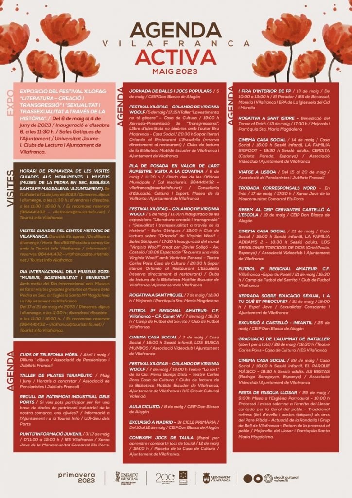 El mes de maig ha arribat a Vilafranca carregat d’activitats lúdiques i culturals. Així les coses, i com és habitual en la localitat, no falten les visites guiades pel nucli històric, als monuments i museus del poble. També es realitzen diversos tallers, cursos i jornades sobre noves tecnologies, esport, educació sexual o folklore popular.