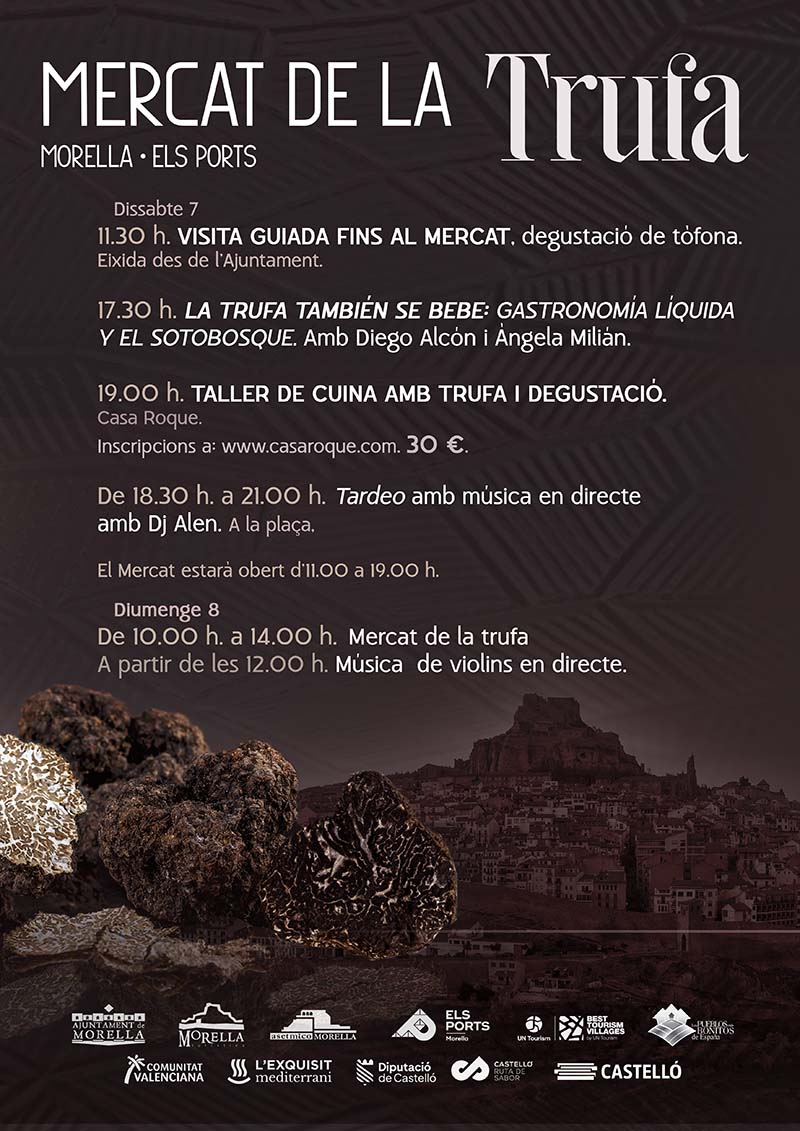 El mercat obrirà dissabte a les 11.00 hores i a les 11.30 hores tindrà lloc la primera activitat amb una visita guiada amb degustació de trufa i eixida des de l’Ajuntament de Morella. A la vesprada hi ha programats dos tallers que mostren la gran varietat d’elaboracions que permet la trufa. A les 17.30 hores serà la demostració La trufa también se bebe: gastronomía líquida y el sotobosque amb Diego Alcón i Àngela Milián i a les 19.30 hores, el taller de cuina amb trufa i degustació de Casa Roque. A les 18.30 hores arrancarà l’actuació en directe de dj Alen a la plaça. Diumenge a les 10.00 hores obrirà el mercat de nou amb l’ambientació de la música de violins a partir de les 12.00 hores.