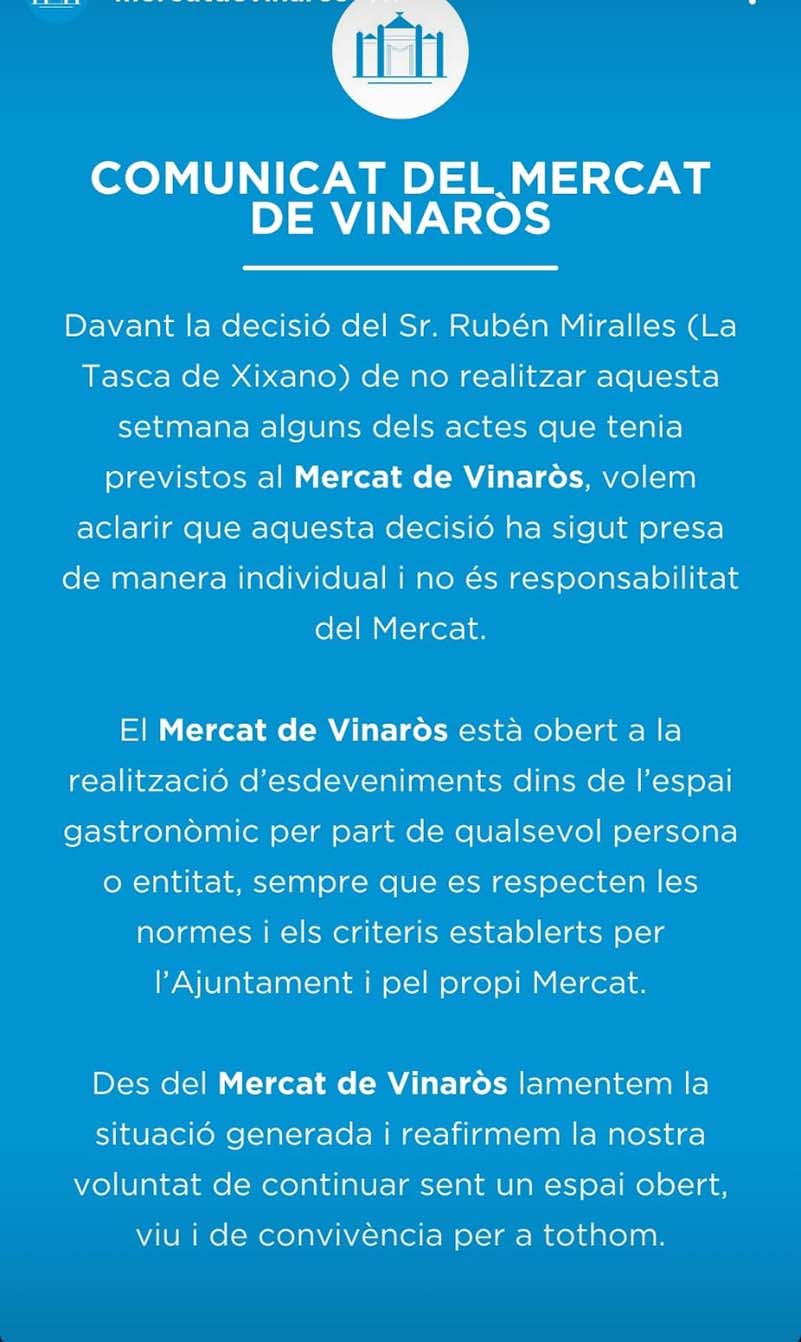 El Mercat de Vinaròs, a través dels seus canals de difusió, ha emés un comunicat en resposta a la decisió de Rubén Miralles de suspendre la celebració de la Tasca de Xixano durant aquest divendres.
