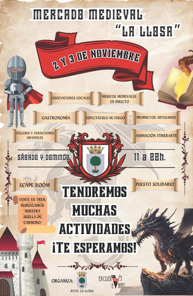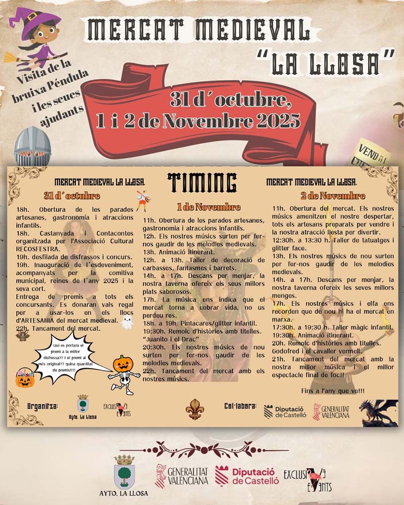 La Llosa tornarà a viatjar al passat amb la celebració del Mercat Medieval 2025, que tindrà lloc del 31 d’octubre al 2 de novembre. Durant tres dies, el municipi es transformarà en un escenari replet de llocs artesans, animació i activitats per a tota la família.