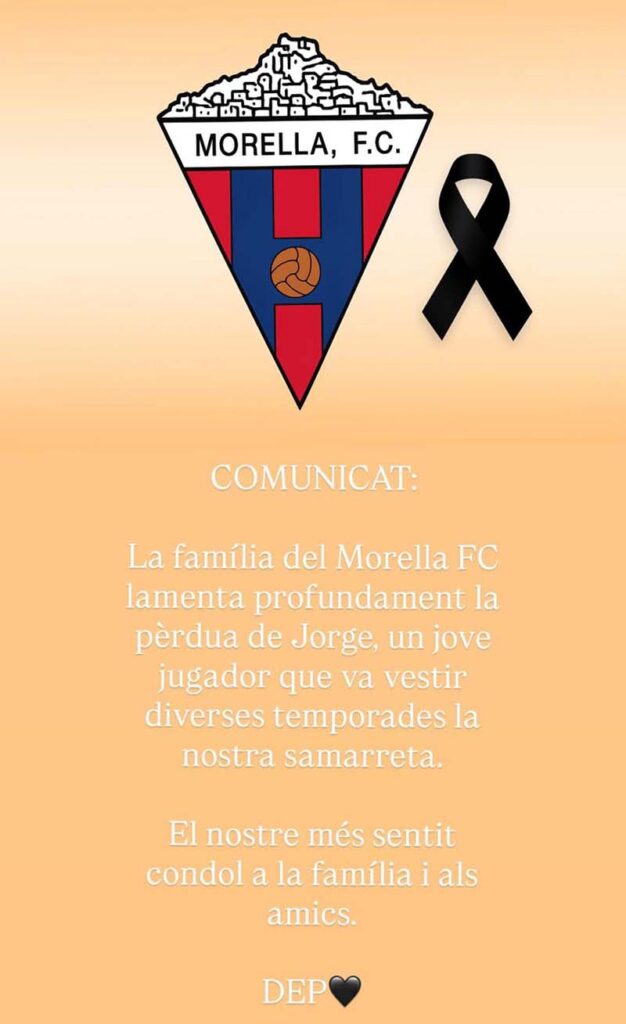 La família del Morella FC ha fet públic un emotiu comunicat en el qual expressa la seva profunda tristesa per la mort de Jorge, un jove jugador que va defensar la samarreta del club durant diverses temporades.