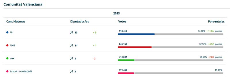 El Partit Popular ha aconseguit la victòria a les eleccions generals a la Comunitat Valenciana. El partit liderat per Alberto Núñez Feijóo ha aconseguit 918.145 vots, un 34,90% del total. Comparant-ho amb els resultats de l’any 2019, el PP puja 11,86% en quant a nombre de vots. En quant a diputats, el PP ha aconseguit 13 diputats, 8 més que fa quatre anys.
