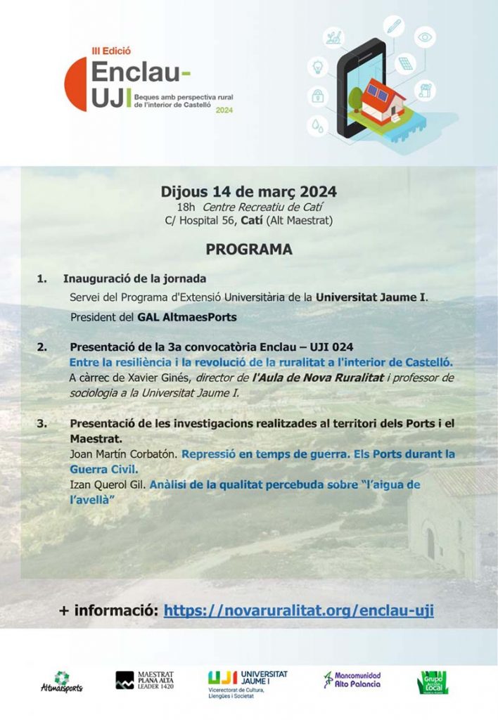- Demà dijous 14 de març tindrà lloc en el Centre Recreatiu de Catí la presentació de la tercera convocatòria del programa Enclau UJI per a atorgar beques amb perspectiva rural a l’interior de Castelló.