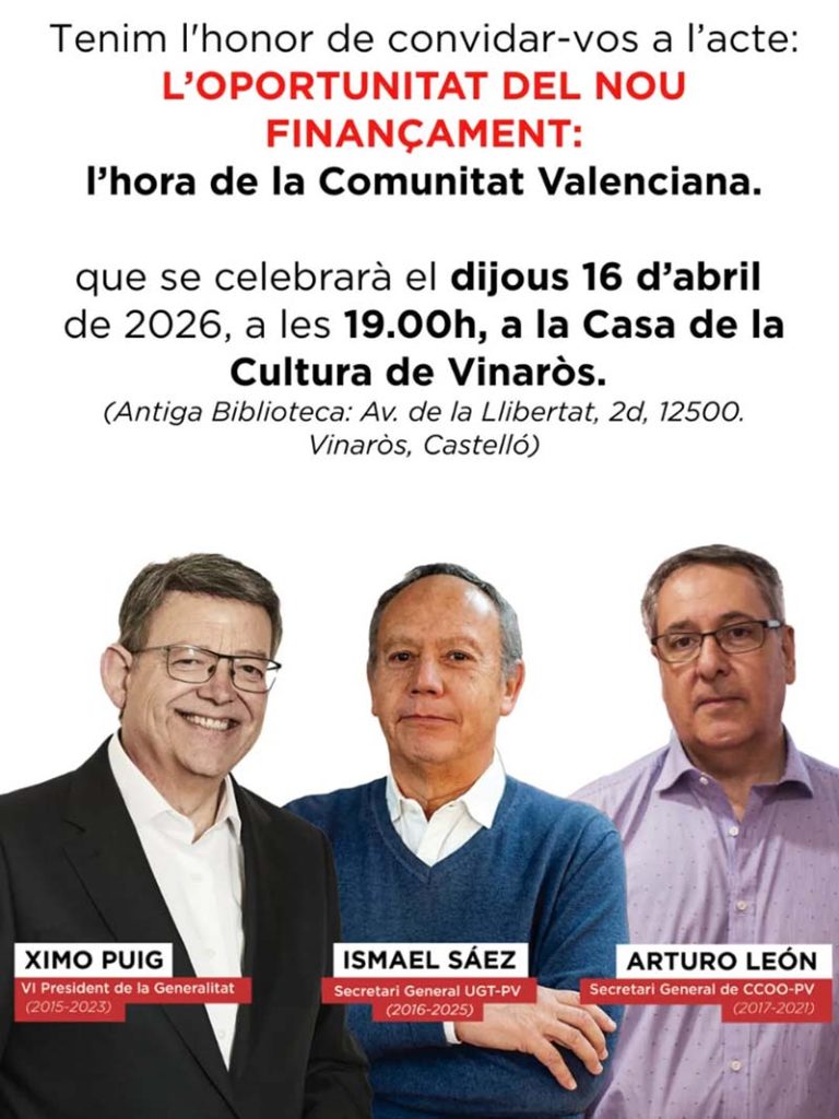 L’acte comptarà amb la presència de l’ex-president de la Generalitat Ximo Puig, així com l’ex-secretari d’UGT-PV, Ismael Sáez, i l’ex-secretari de CCOO-PV, Arturo León.