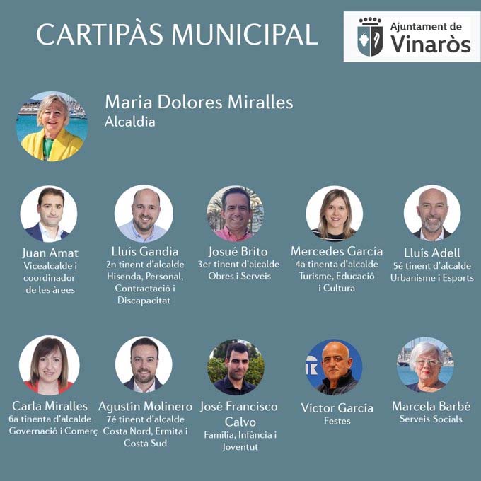 Destaca que el portaveu del Partit Popular, Juan Amat, serà el vicealcalde, càrrec que es crea per primera vegada a l’Ajuntament i es creen les regidories de la de Costa nord, costa sud i ermita, i la de familia. No consta a l’organigrama la regidoria d’agricultura i pesca i tampoc la dedicada a Fons Europeus i Smart City i Transició Ecològica que abans hi havia.