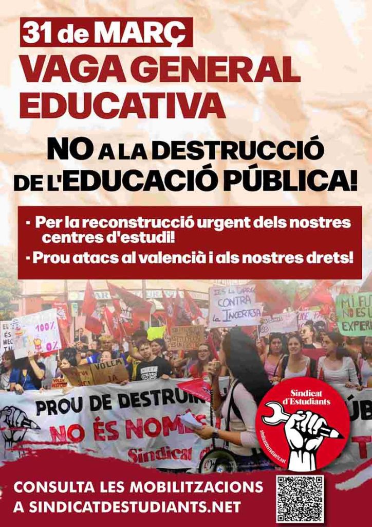 El Sindicat d’Estudiants del País Valencià ha convocat, per al proper dimarts 31 de març, una vaga general educativa al País Valencià. Sota el lema “No A La Destrucció De L’Educació Pública!“, el Sindicat argumenta, a través d’una nota de premsa en la seva pàgina web, que “estudiants, professors i professores anirem a la vaga educativa per parar-ho tot en els nostres centres educatius i plenar els carrers contra les retallades, els atacs i les privatitzacions del Govern de PP i VOX“.