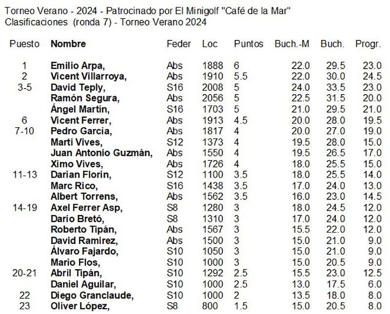 Van completar el podi els locals Vicent Villarroya, amb 5’5 punts, i David Teply amb 5 punts. Altres jugadors que també van assolir els 5 punts durant les 7 partides en joc van ser el vinarossenc Ramon Segura, quart, i el peniscolà Ángel Martín, que va aconseguir trofeu com a campió sub16.