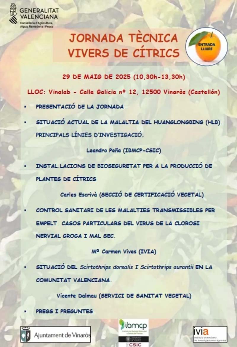 Aquesta jornada està organitzada per la Conselleria d’Agricultura, Aigua, Ramaderia i Pesca de la Generalitat Valenciana, i compta amb el suport de l’Ajuntament de Vinaròs, l’IBMCP-CSIC, IVIA (Institut Valencià d’Investigacions Agràries) i Servei de Sanitat Vegetal.