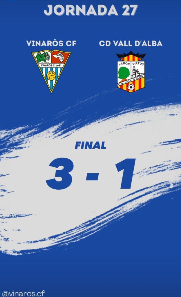 El Vinaròs C.F. ha aconseguit aquesta vesprada una important victòria per 3 gols a 1 contra el C.D. Vall d’Alba en el partit corresponent a la vint-i-setena jornada de la Primera FFCV, disputat a l’Estadi de la Ciutat Esportiva.