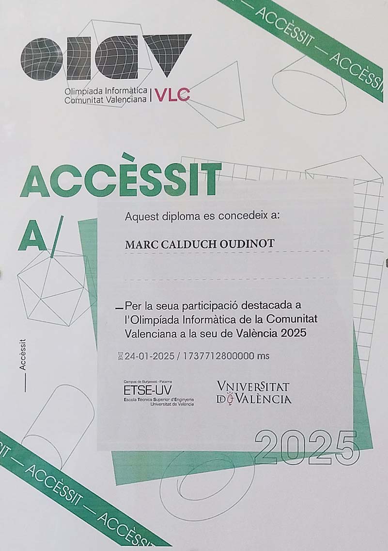L’alumne de l’IES Leopoldo Querol, Marc Calduch, es va classificar a la seu valenciana en quarta posició, molt a prop dels que finalment si aniran al campionat nacional. A banda de la classificació del 1r classificat per a la final nacional, la Universitat de València premia als 3 primers classificats amb una ajuda a l’estudi amb 1000 € si l’alumne es matricula a la UV, i concedeix un accèssit a un concurs classificatori obert als alumnes en 4a i 5a posició.
