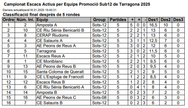 Un total de 16 equips de 4 jugadors fins als 12 anys d’edat es van aplegar a Riudoms la tarda de dissabte 18 de gener per a disputar el Campionat d’Escacs Actius per Equips Promoció Sub-12 de Tarragona 2025. Després de 5 rondes i 20 punts en joc, l’Amposta ‘A’ s’hi proclamava campió amb 16’5 punts, mentre que el Riu Sénia Benicarló ‘B’ aconseguia el subcampionat amb 13. També l’equip ‘A’ sumava fins a 8 punts al 13é lloc de la classificació, malgrat comptar durant tot el torneig amb un jugador menys, d’un torneig oficial amb molts dels millors clubs de la demarcació.