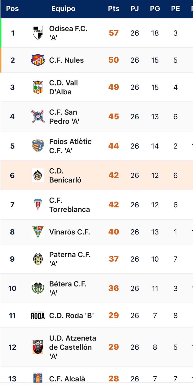 Amb aquest triomf, el CD Benicarló es col·loca en la 6a posició de la classificació de la Primera FFCV, consolidant la seua bona dinàmica en la competició.