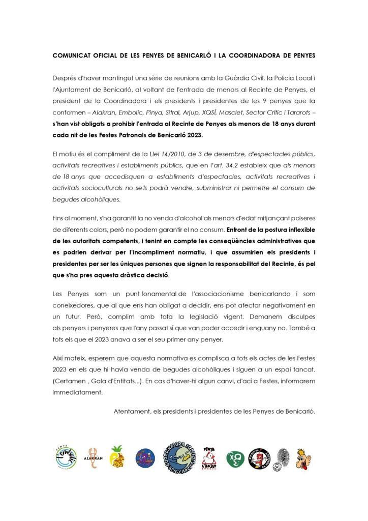 Els menors no podran accedir al recinte de Penyes les properes Festes Patronals de Benicarló