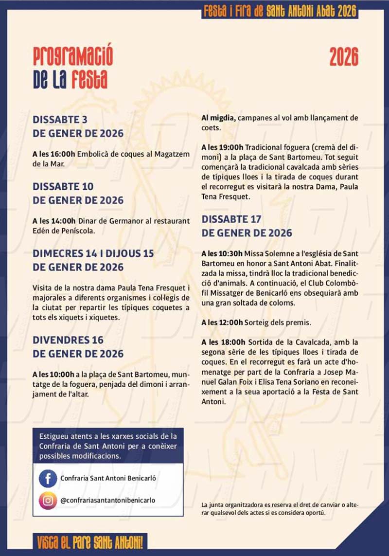 La programació continuarà el proper cap de setmana amb les celebracions en honor a Sant Antoni. El divendres 16 de gener tindrà lloc la cremà del Dimoni, i el dissabte se celebrarà la tradicional missa i benedicció dels animalets, una de les tradicions més arrelades i estimades per la ciutadania.