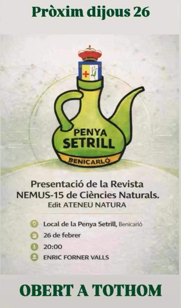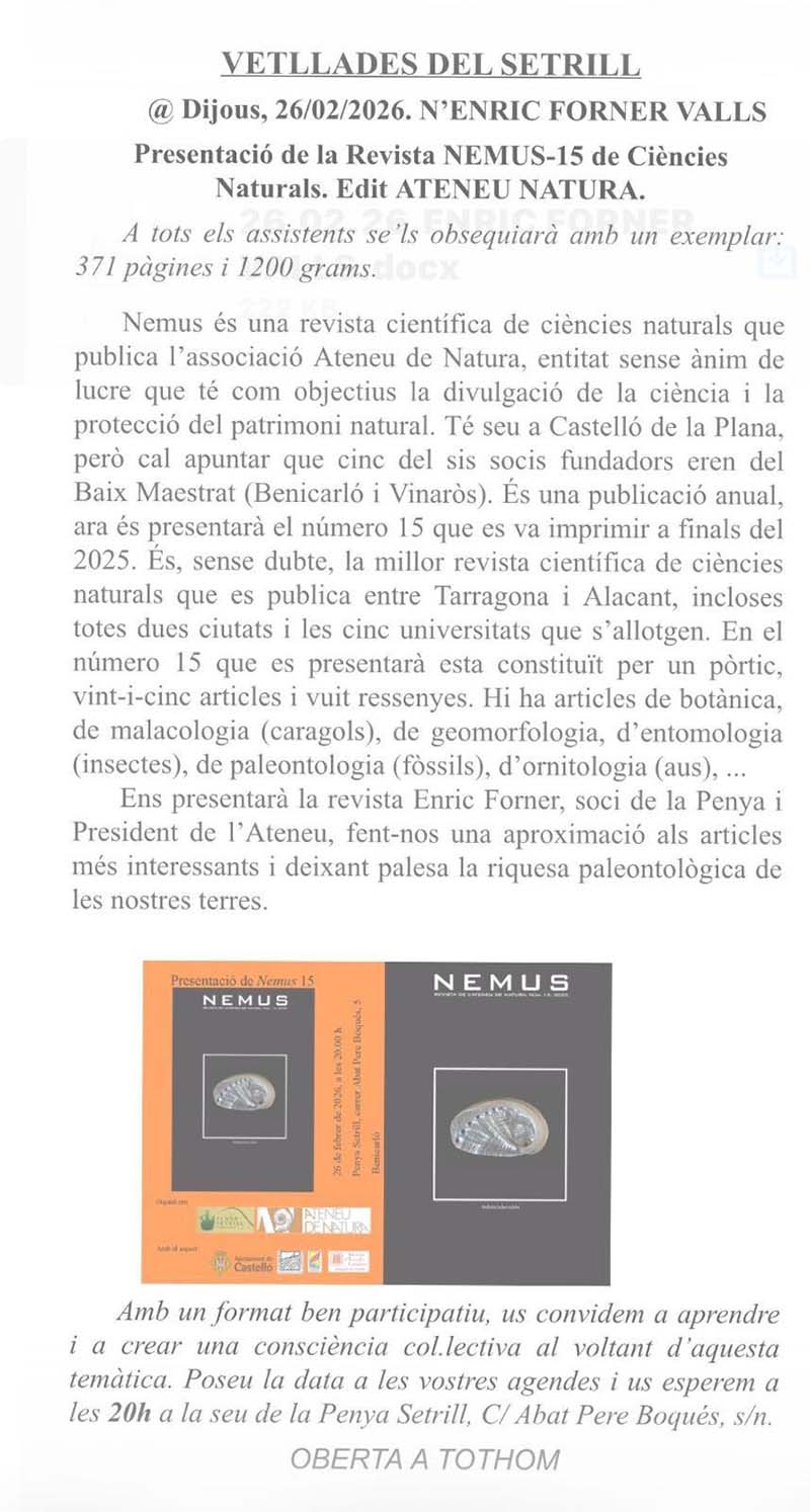 La Penya Setrill acollirà aquest dijous 26 de febrer a les 20.00 hores la presentació del número 15 de la revista NEMUS, editada per Ateneu Natura.