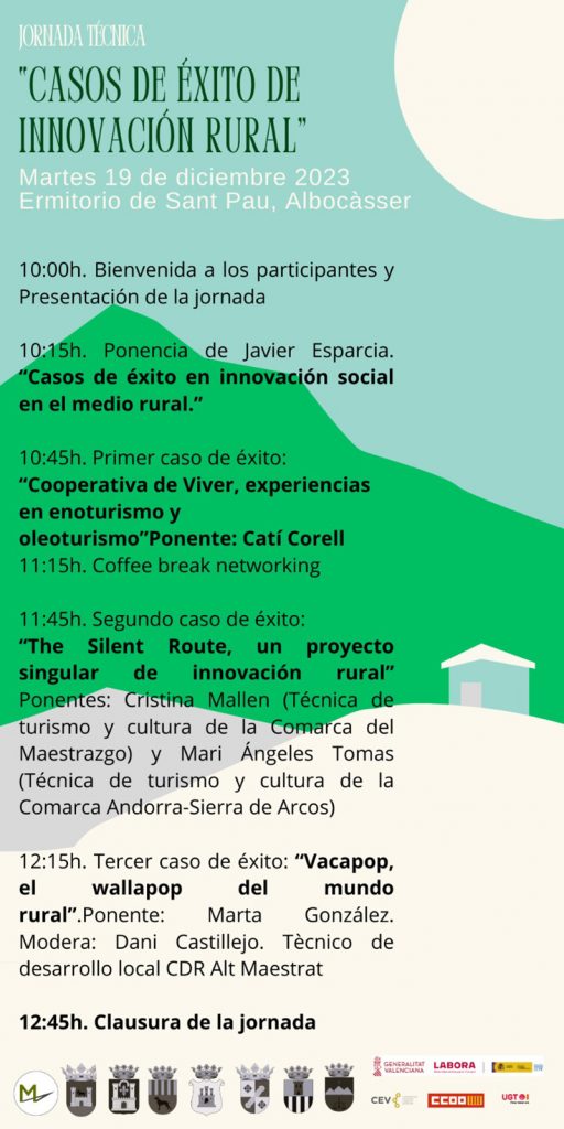 A les 10.15h, Javier Espacia oferirà una ponència sobre els casos d’èxit d’innovació social en el medi rural. A les 10.45h, Cati Corell exposarà el primer cas d’èxit del dia, centrat en la Cooperativa de Viver i les experiències en enoturisme i oleoturisme.