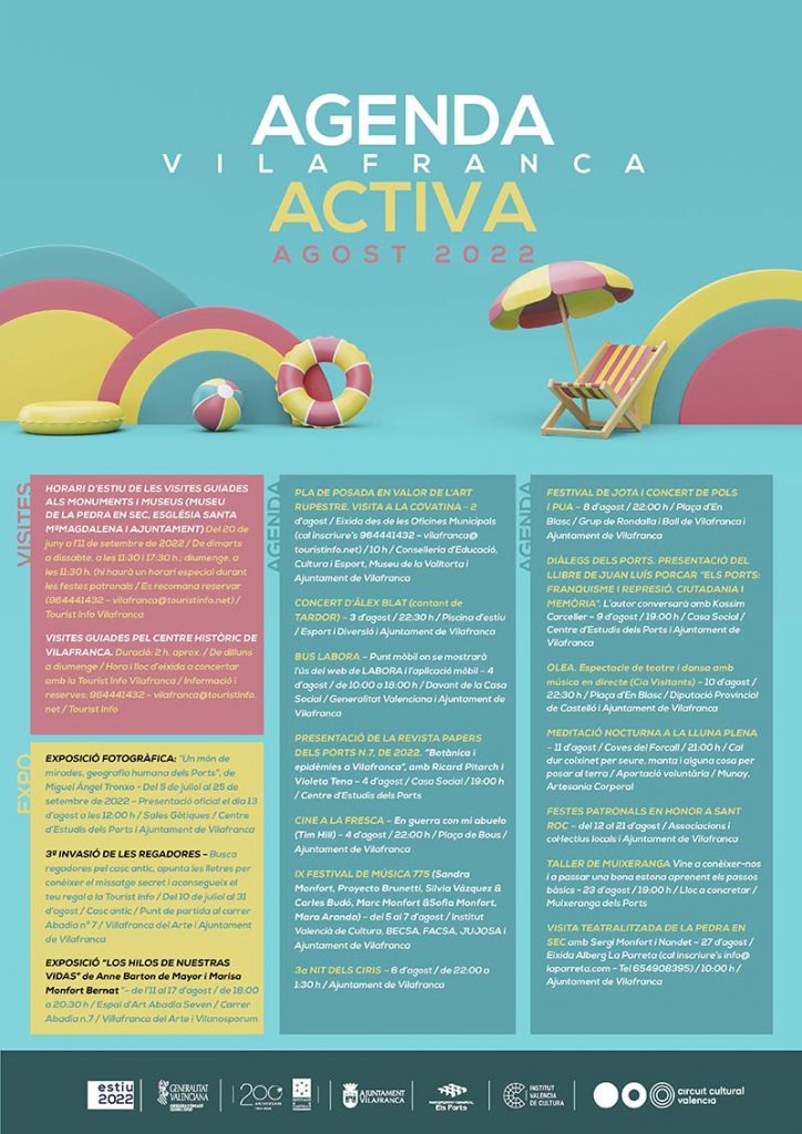 Indicar, a més, que durant tot el mes tenen lloc visites guiades al Museu de la Pedra en Sec, l’Església de Santa María Magdalena, l’ajuntament o el nucli històric. Així mateix, es pot gaudir de diferents exposicions com ‘Un món de mirades, geografia humana dels Ports’ de Miguel Ángel Tronxo; ‘3a invasió de les regadores’ amb una divertida gimcana pel poble; o ‘Els fils de les nostres vides’ d’Anne Barton de Major i Marisa Monfort Bernat.