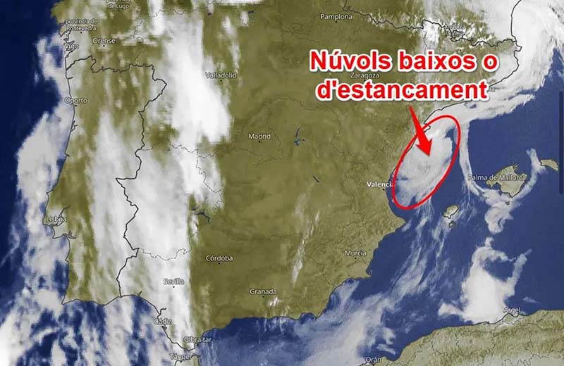 En aquesta imatge del satèl·lit Meteosat podem observar les núvols baixos o de situació d’estancament que tenim en aquests moments sobre nosaltres. Es tracta de núvols que es formen en capes baixes de l’atmosfera, sovint associats a elevada humitat i absència de vent, generant cels coberts i sensació de temps apagat.