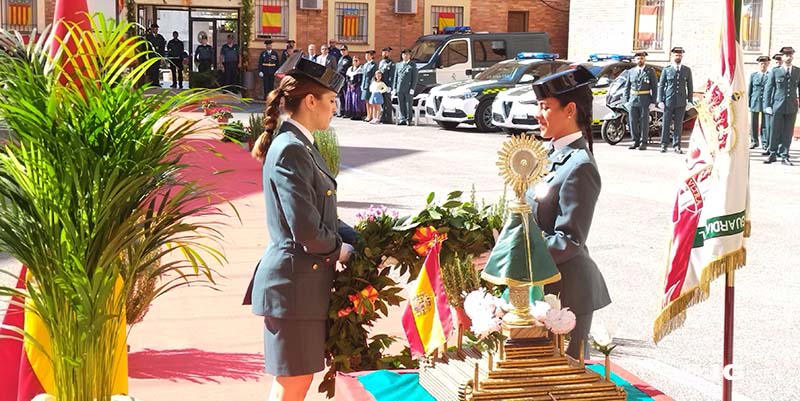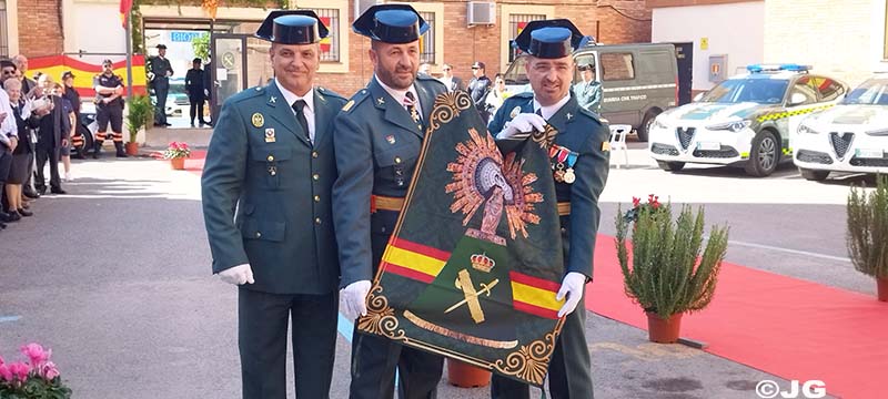 Para finalizar como colofón a este emotivo acto y en representación de los “Polillas” destinados en el Destacamento de Tráfico de la Guardia Civil en Benicarló, el Cabo 1° D. FRANCISCO FERNÁNDEZ ABELLAN y el Guardia Civil D. FRANCISCO JAVIER BENITEZ RODRÍGUEZ, hace entrega de un Pendón con la Imagen de la Santísima Virgen del Pilar, con el objeto de que, en adelante, presida los actos que se celebren en Su Honor, en este acuartelamiento.