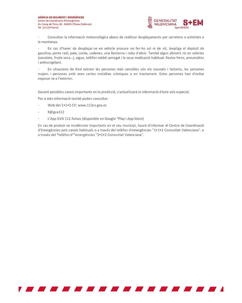 Davant aquesta situació, es recomana a la ciutadania extremar la precaució, especialment en els desplaçaments, i mantindre’s informada a través dels canals oficials del Centre de Coordinació d’Emergències, AEMET i les autoritats competents.
