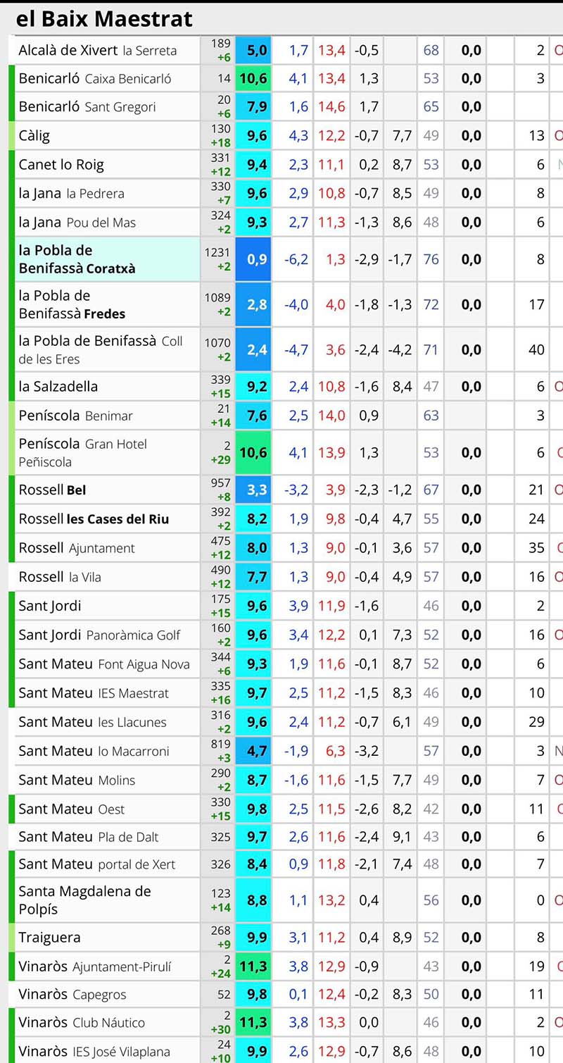 La localitat de Coratxà, al terme municipal de la Pobla de Benifassà, ha registrat la temperatura mínima més baixa de tota la comarca del Baix Maestrat, amb -6,2 °C, segons les dades recollides per les estacions meteorològiques de la zona.