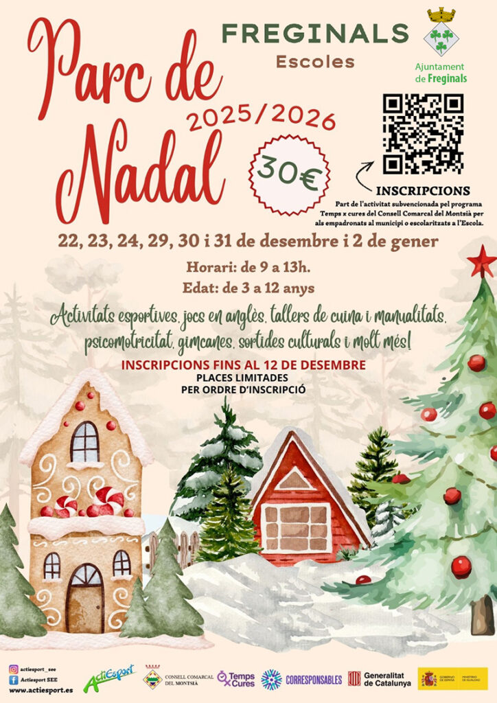 L’Ajuntament de Freginals ha presentat el Parc de Nadal 2025/2026, una proposta d’oci educatiu adreçada a infants d’entre 3 i 12 anys que se celebrarà els dies 22, 23, 24, 29, 30 i 31 de desembre, així com el 2 de gener, a les escoles del municipi.