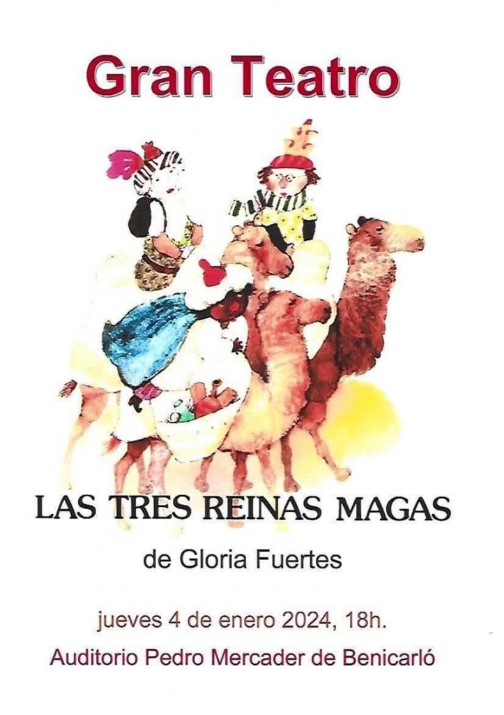 Hoy jueves 4 de enero representación de la obra de teatro familiar “Las tres reinas magas” de Gloria Fuertes. Apta para todos los publicos. Bajo la dirección de Josi Ganzenmüller Roig.