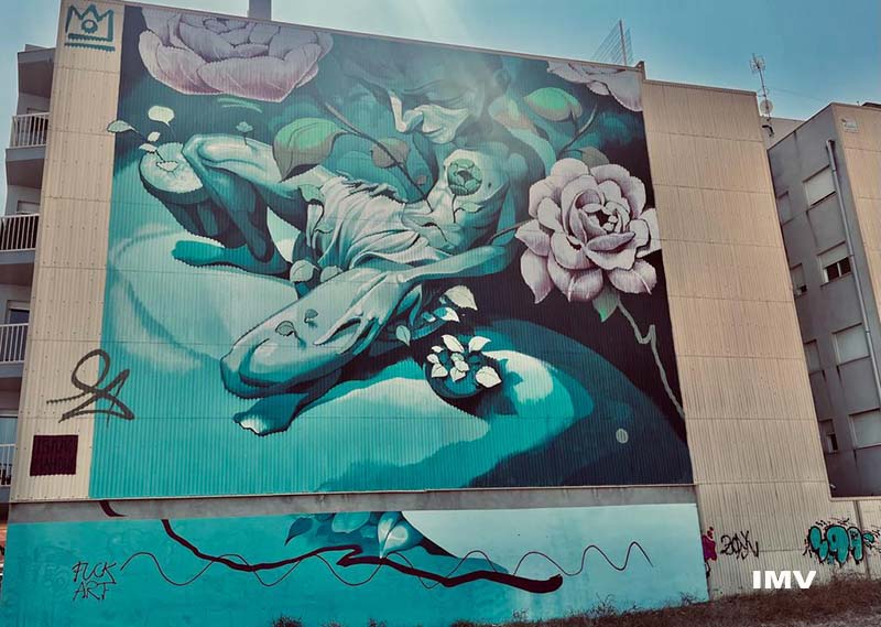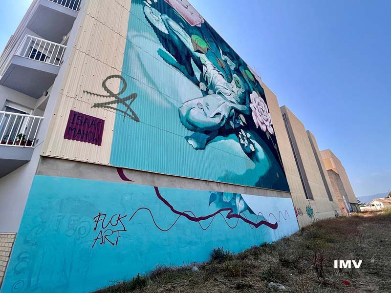 Avui ha estat la nostra sorpresa, quan hem anat a realitzar la fotografia al mural sense la grua elevadora que ha utilitzat per a la part superior del dibuix. Ha estat llavors quan hem observat en la part inferior un missatge en color vermell que posava “FUCK ART” i unes ones de punta a punta de mural.