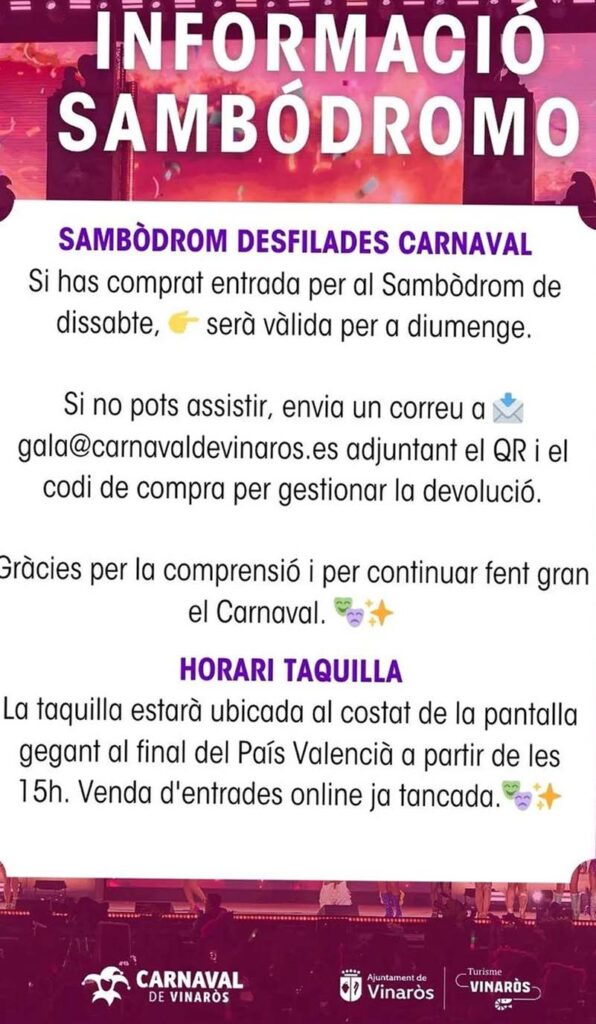 El Carnaval indica que, si s’ha comprat una entrada per a la jornada del dissabte, serà vàlida també per al diumenge. A més, si no es pot assistir, es prega enviar un correu a gala@carnavaldevinaros.es adjuntant el codi QR i el codi de compra per gestionar la devolució.