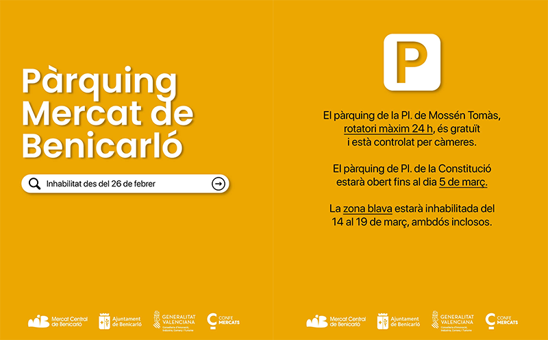 Així mateix, s’informa que la zona blava quedarà suspesa del 14 de març fins al 19 de març de 2026, amb motiu dels actes centrals de les festes falleres.