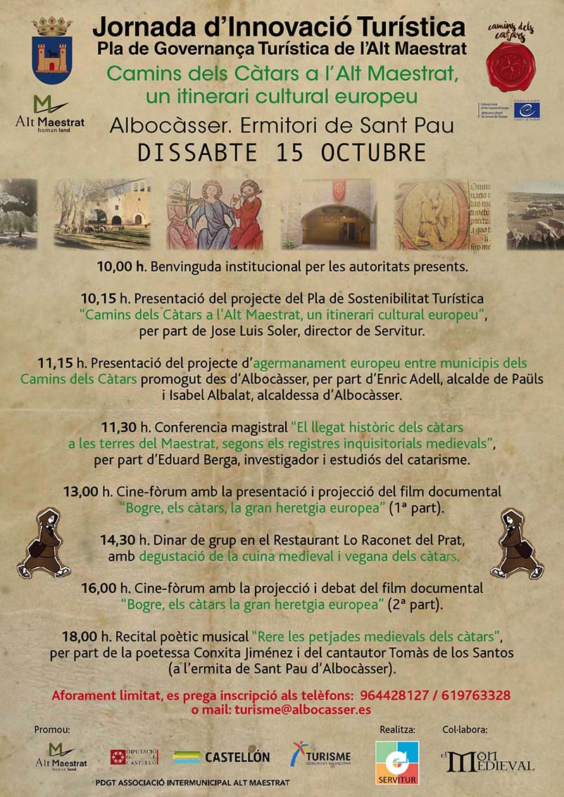 El pròxim dissabte 15 d’octubre tindrà lloc al conjunt monumental de l’Ermitori de Sant Pau d’Albocàsser una jornada d’innovació turística cultural, en el marc del Pla de Governança Turística de l’Alt Maestrat, amb el títol “Camins dels Càtars a l’Alt Maestrat, un itinerari cultural europeu”, organitzat per l’Associació Intermunicipal Alt Maestrat, amb la col·laboració de Turisme Comunitat Valenciana i Patronat de Turisme de Castelló, i també amb el suport de l’Ajuntament d’Albocàsser i l’assistència tècnica de l’empresa Servitur dels Ports. La jornada té l’objectiu de seguir posant en valor turístic i culturalment l’Ermitori de Sant Pau d’Albocàsser com un dels llocs de referència del nord de la província de Castelló i del Maestrat de la cruïlla de camins ancestrals d’origen medieval i en especial dels camins dels càtars i el seu projecte d’itinerari cultural europeu del Consell d’Europa. El projecte d’agermanament europeu amb altres municipis com poden ser Paüls, Minerve o Monforte d’Alba generarà una projecció europea de gran interès.