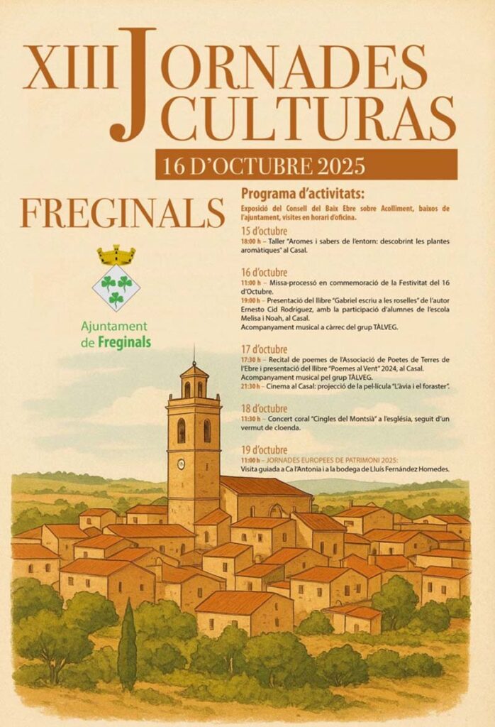 El poble de Freginals celebra un any més les tradicionals Jornades Culturals del 16 d’Octubre, amb un complet programa d’activitats per a tots els públics. Durant cinc dies, el poble acollirà tallers, presentacions de llibres, recitals, cinema, concerts i visites guiades que posaran en valor la cultura i les tradicions locals.