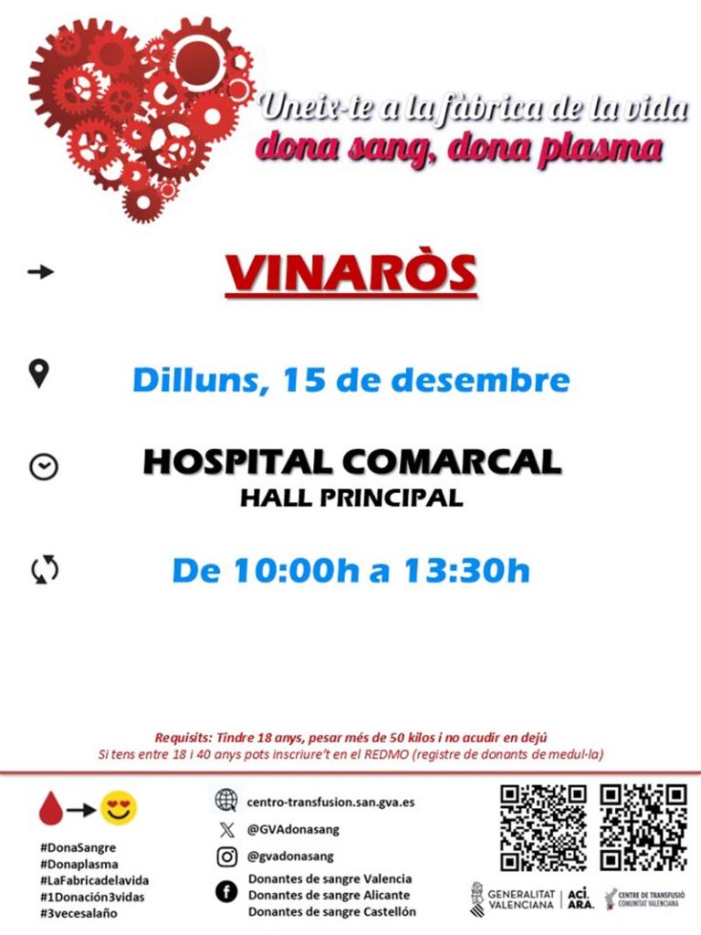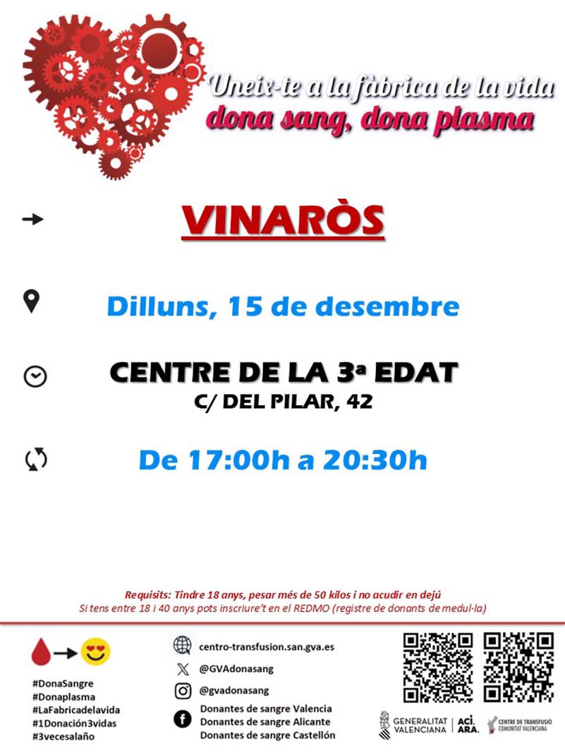 Aquest dilluns 15 de desembre, el Centre de Transfusió de la Comunitat Valenciana ha habilitat dos punts de donació de sang a la ciutat de Vinaròs.