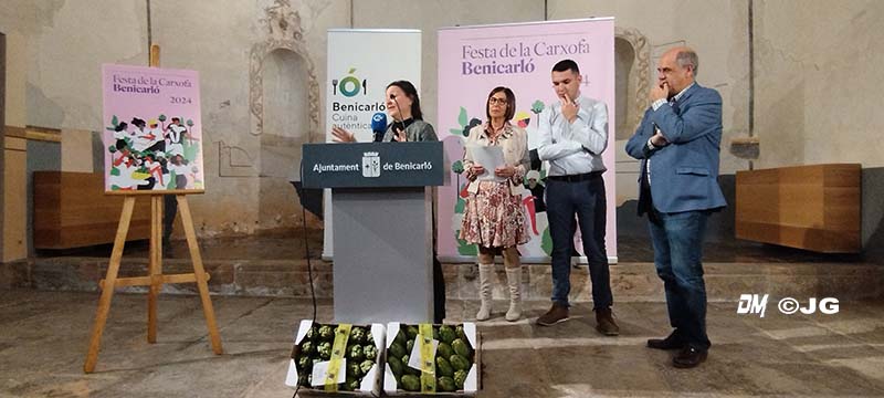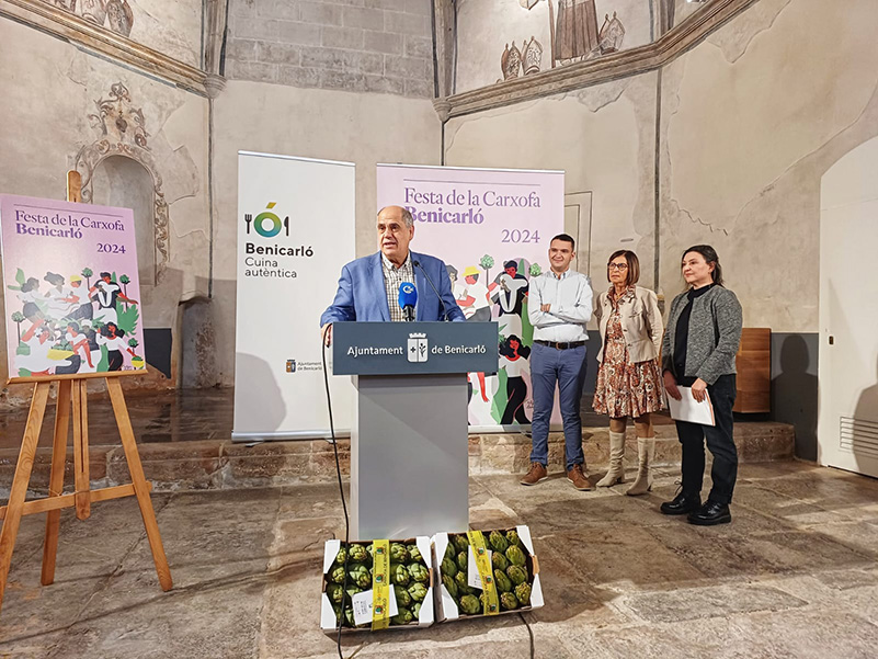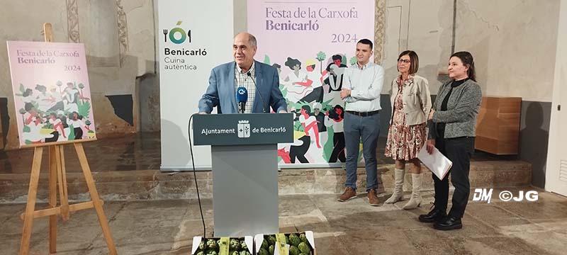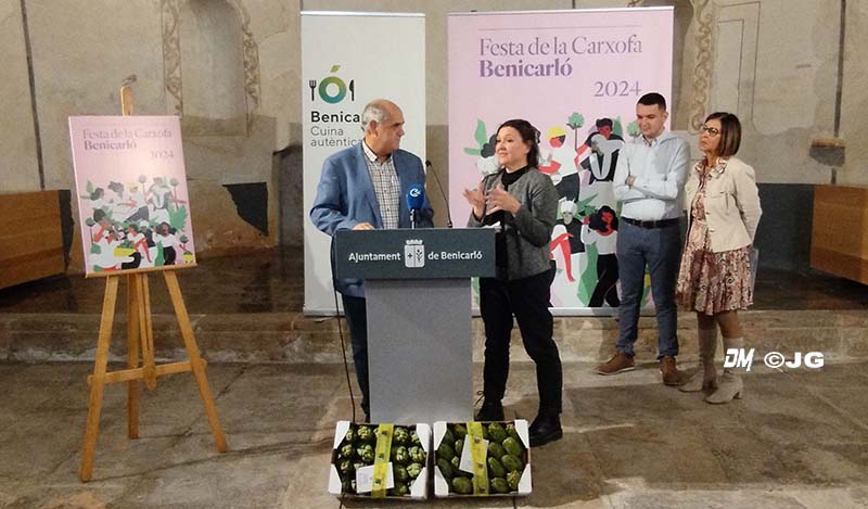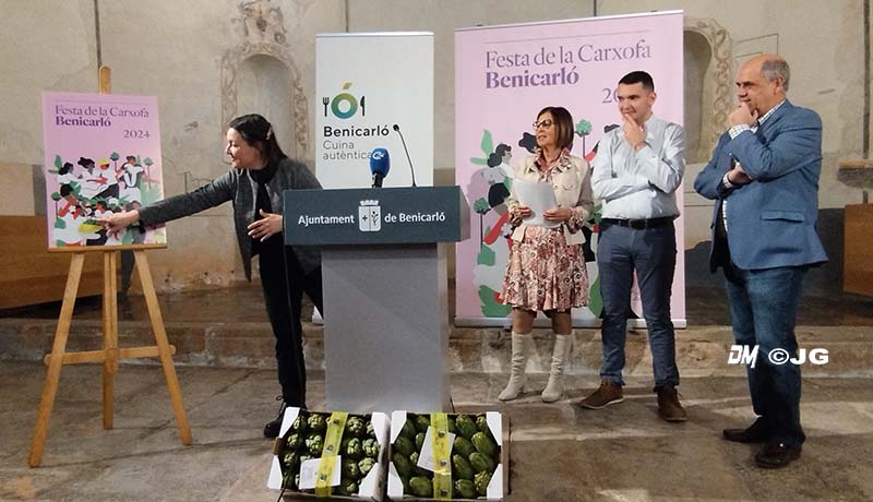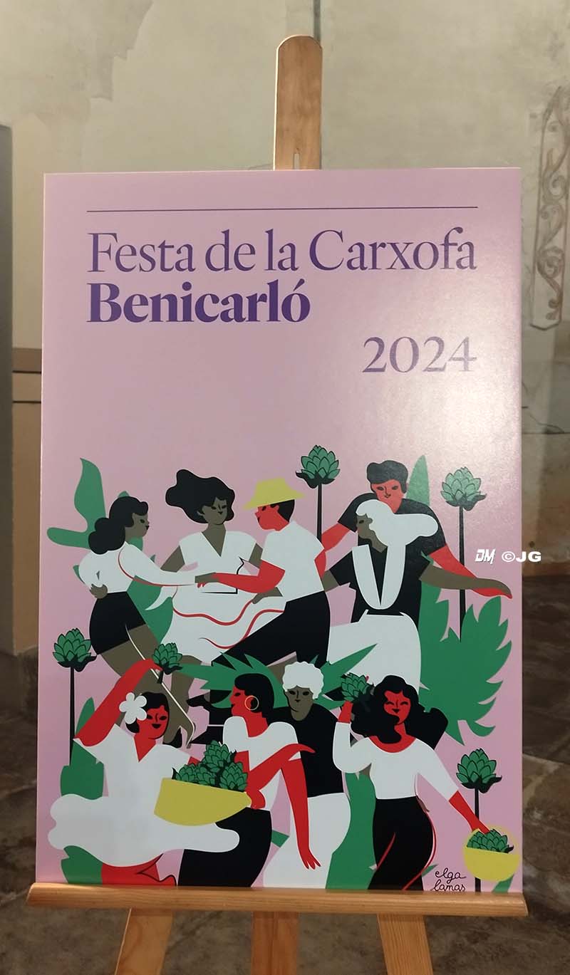 La Festa de la Carxofa 2024 ha començat a caminar avui amb la presentació oficial del cartell anunciador, obra del dissenyador benicarlando Juan Carlos Palau i la il·lustradora gallega Elga Fernández Lamas. L’alcalde de Benicarló, Juanma Cerdá, acompanyat de la il·lustradora i dels regidors de Turisme i Agricultura, Inma Calvet i Borja Castell respectivament, ha presentat el treball, una imatge viva, plena de colors vibrants i que dona el protagonisme a la dona llauradora.